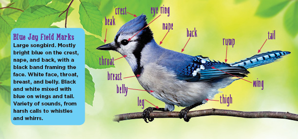 While driving to work in Blairstown, a bird flashed across the road in front of me. Since I’ve been a “birder” from childhood, I immediately recognized it–a Blue Jay, easily identified by the shape of it’s head, size, flight pattern, and of course, its bright blue color. All these things are Field Marks, and anyone who watches birds learns early on to spot them.